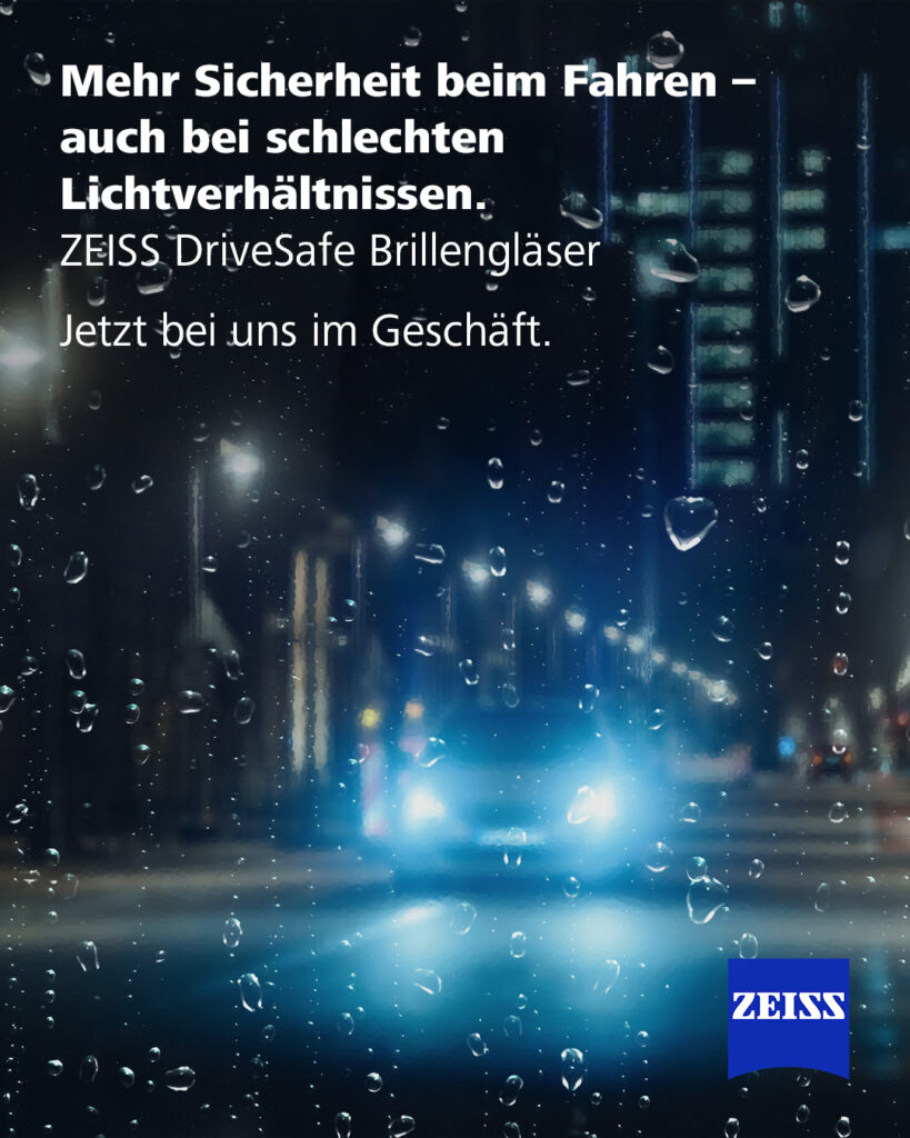 Mit ZEISS DriveSafe Brillengläsern sehen Sie klar – auch bei Nässe, Nebel und Dämmerung. Sie fühlen sich nachts weniger von entgegenkommenden